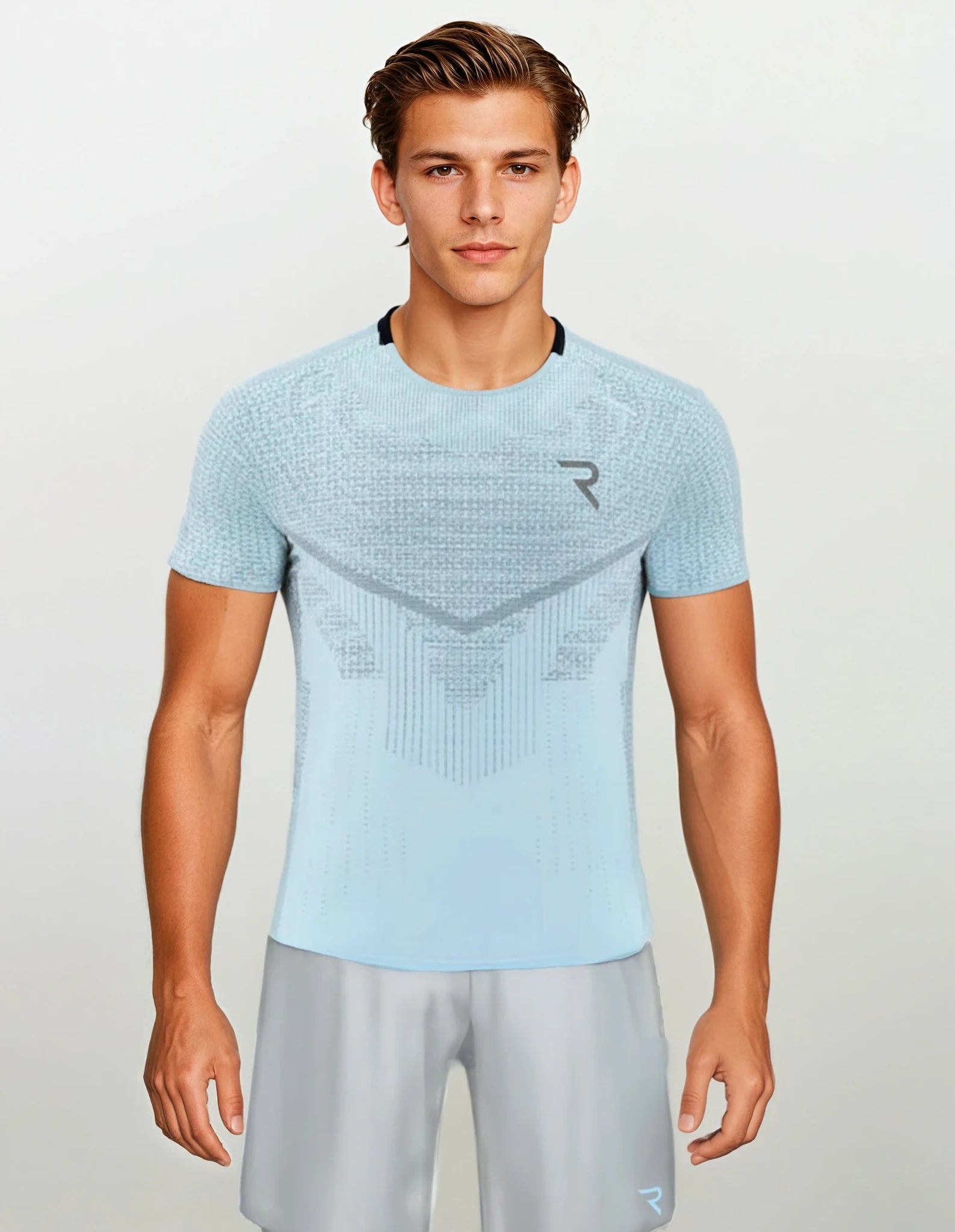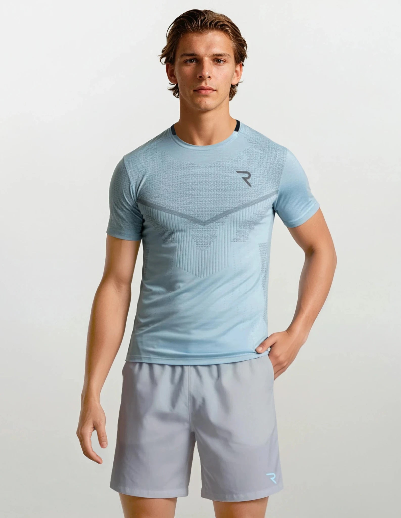 Til je training naar een hoger niveau met deze ultralichte performance set. Het naadloos geweven shirt biedt maximale bewegingsvrijheid en voelt dankzij de ademende structuur koel en comfortabel aan, zelfs tijdens intensieve workouts. De subtiele textuur en het moderne patroon op de borst geven het shirt een strakke, technische uitstraling.
